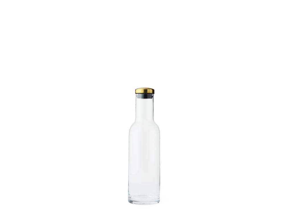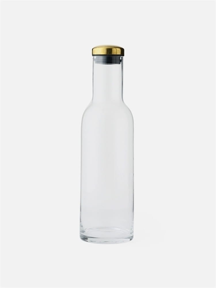 Butelka do wody lub wina o pojemności 1 litra z linii Bottle, wykonana jest z przezroczystego szkła, wykończona mosiądzem. Projekt Norm Architects.