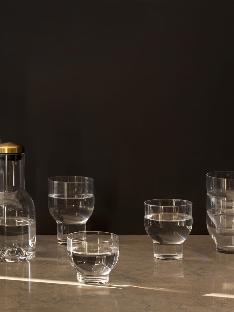 Karafka do wody o pojemności 0,5 litra z linii Bottle, wykonana jest z przezroczystego szkła, wykończona mosiądzem. Projekt Norm Architects.