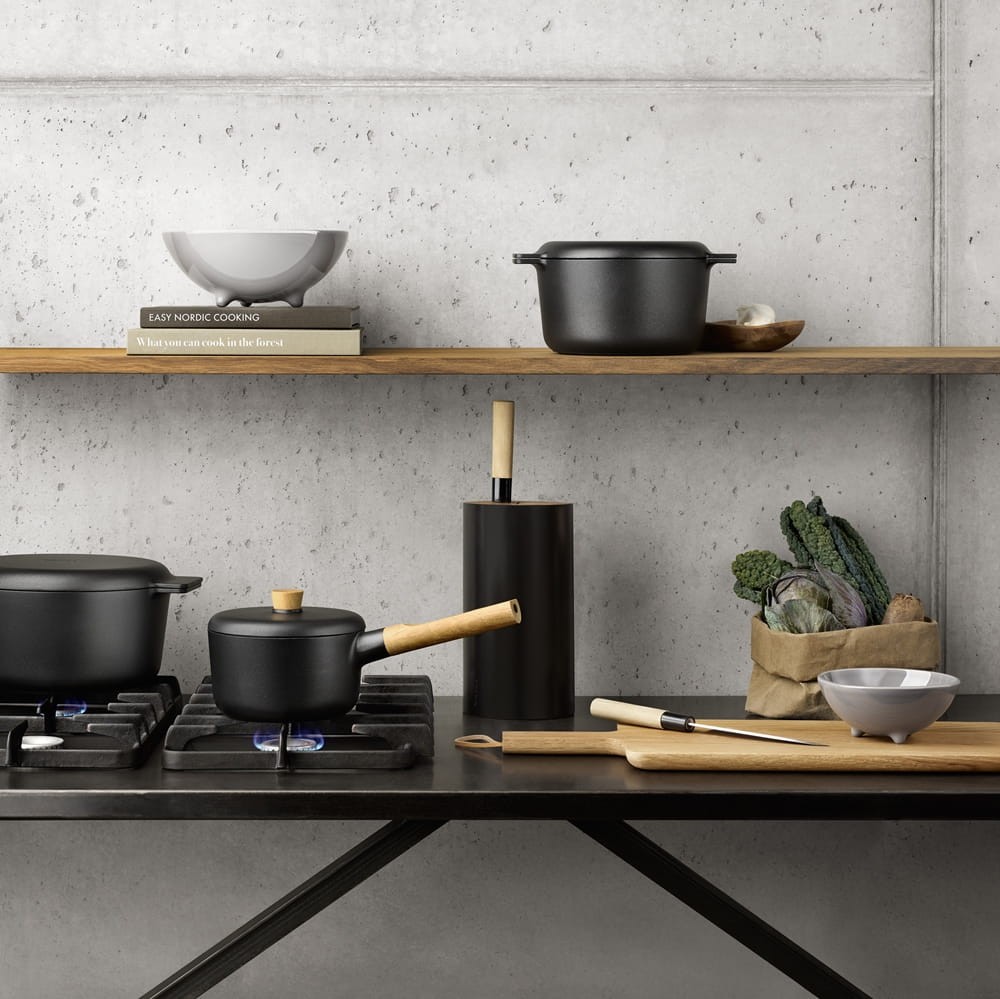Linia aluminiowych naczyń kuchennych Nordic Kitchen w kolorze czarnym z dębowymi uchwytami, wyróżnia się lekkością i elegancją. Jest idealna do codziennego użytkowania w kuchni. Wykonana z materiałów najwyższej jakości, co zapewnia jej trwałość, można ją łatwo łączyć z innymi garnkami i naczyniami marki Eva Solo.